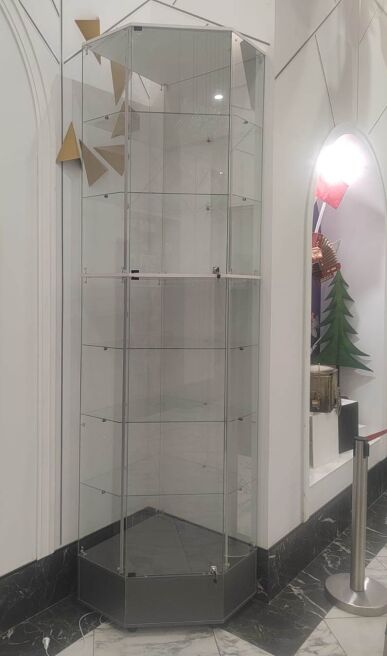 Стеклянная угловая витрина для экспонатов с подсветкой