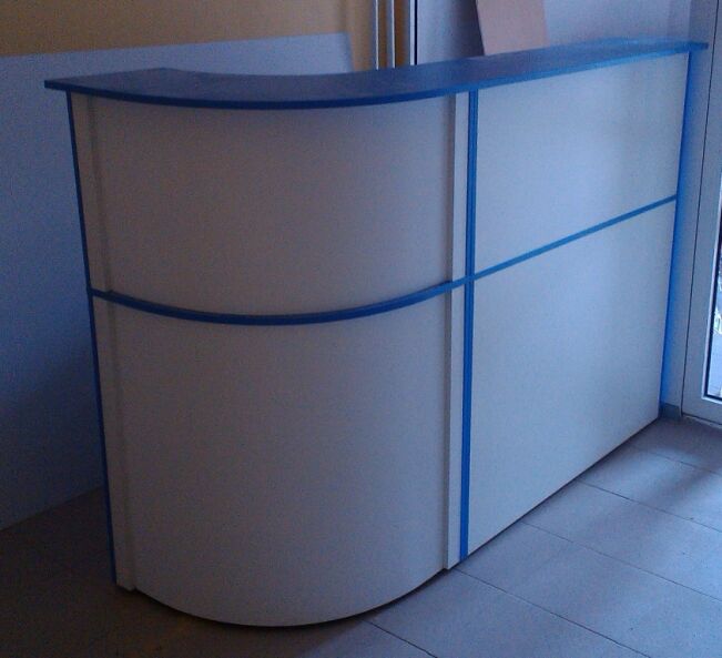 Стойка администратора небольшая для офиса, салона, медицинского центра, ресепшн для клуба - каркас изготовлен из ЛДСП 16 мм с применением современных материалов заполнения. Наличие в системе прямых и радиальных модулей позволяет получить стойку ресепшн закругленной формы.